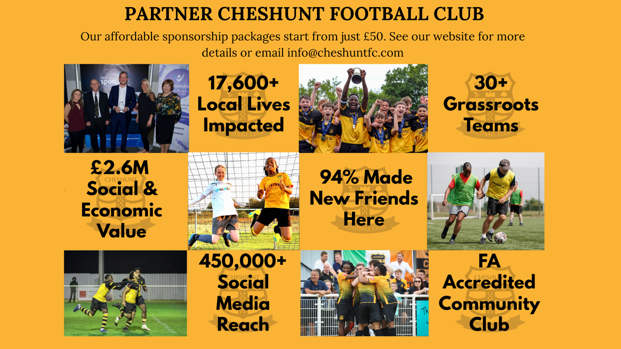 Whether you’re a local business or a national brand, supporting Cheshunt FC is a way to connect with real people—families, fans, and community partners—who value what you stand for.